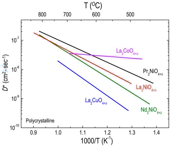 Arrhenius plots of oxygen tracer diffusivity (D*) for different RP oxides. Effect of B-site substitutions on D* for La2BO4+δ (B = Co, Ni, and Cu) polycrystalline oxides: La2CoO4+δ (Ref. [77]), La2NiO4+δ (Ref. [51]), and La2CuO4+δ (Ref. [98]). The D* values for Pr2NiO4+δ and Nd2NiO4+δ (Ref. [51]) are also plotted for comparison.