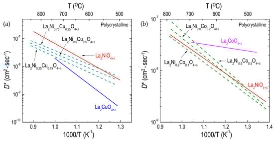Arrhenius plots of oxygen tracer diffusivity (D*) for different RP oxides: (a) effect of Ni substitution on the B site on D* for La2Ni1−xCuxO4+δ (Refs. [51,98]) polycrystalline; and (b) effect of Ni substitution on the B site on D* for polycrystalline La2Ni1−xCoxO4+δ (Refs. [77,94]) polycrystalline oxides.