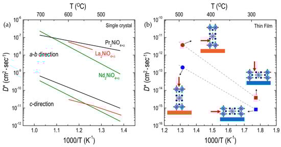 The effect of crystallographic orientation on the oxygen ion transport can be more clearly seen in thin films. Recently, Chen et al. [109] successfully fabricated LSC214 (Sr = 0.25) thin films grown in two different crystallographic orientations, i.e., (100) and (001), using (100) LaSrAlO4 (LSAO) and (001) SrTiO3 (STO) substrates. They demonstrated that the oxygen diffusivity along the a-b plane in the (100)-oriented LSC214 film was three orders of magnitude lower than that in the (001)-oriented LSC214 film (Figure 8b). Moreover, the D* value along the c-direction in the (001)-oriented LSC214 film was found to be one order of magnitude higher than that along the a-b plane in the (100)-oriented LSC214 film.