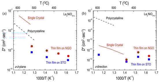 Arrhenius plots of oxygen tracer diffusivity (D*) for La2NiO4+δ films: (a) D* along the a-b plane; and (b) along the c-direction for La2NiO4+δ films on SrTiO3 (STO) and NdGaO3 (NGO). Thin film [58], single-crystal [97], and polycrystalline [51] data are comparatively shown.