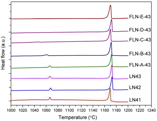 DSC curves of congruent LiNbO3 (LN41 to LN43) and Fe-doped LiNbO3 (FLN-x-43, x = A to E).