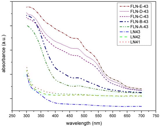 UV-Vis absorption spectra of congruent LiNbO3 (LN41 to LN43) and Fe-doped LiNbO3 (FLN-x-43, x = A to E).