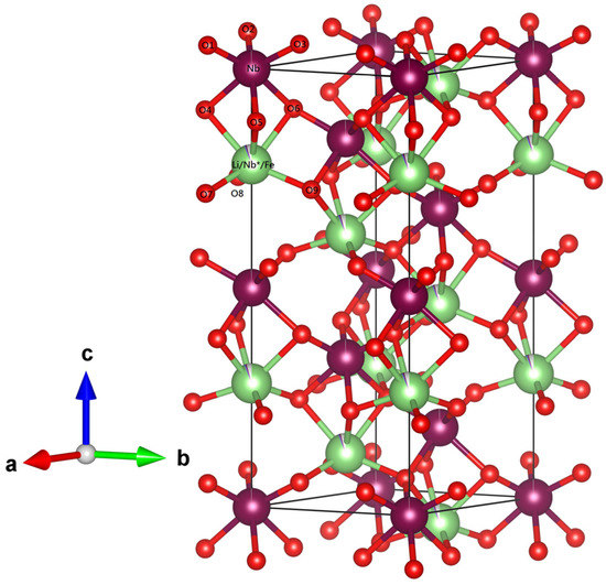 Atomic structure of Fe-doped LiNbO3; Li ion (in green), Fe ion (in blue), Nb ion (in purple), O ion (in red).