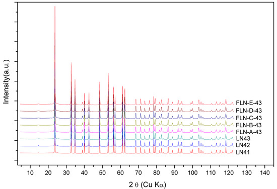 Figure 1 displays the DSC curve of congruent LiNbO3 and Fe-doped LiNbO3. The value of each Tc peak and the corresponding Xc by Equation (4) are shown in Table 1. Fe/Nb ratio of Fe-doped LiNbO3 is shown in Table 2. Figure 1 demonstrates that there are two phase transition peaks in the DSC curve of congruent LiNbO3, which correspond to Xc = 46.55% and 49.24% in LN43. Moreover, the intensity of the higher Tc was much stronger than the lower one. The existence of two peaks coincides with the observation of phase splitting in the previous report [36], where Li0.91NbO3 and LiNbO3 structures were formed to reduce the lattice distortion in the calcining process. There is a deviation between the calculated Xc and the stoichiometry in the experiment procedure that could be attributed to the indeterminate amount of water of crystallization in the ammonium niobate (V) oxalate hydrate. We have also observed that there was no apparent change in the Tc of congruent LiNbO3 with different stoichiometry. It seems that the combustion method is insensitive to the stoichiometry of LiNbO3 and has a wide tolerance for the chemical composition error. The Fe-doped LiNbO3 with relatively low concentration below 1 mol % like FLN-A-43 and FLN-B-43, also has two Tc peaks and the values are similar to those of undoped ones. The lower Tc peak disappears in Fe-doped LiNbO3 with a concentration above 1 mol %, such as FLN-x-43 (x = C, D, E). Although Equation (4) is applied for undoped LiNbO3, it may still imply that doping by Fe eliminates the phase that contains relatively more defects and hence renders the crystal structure stable.