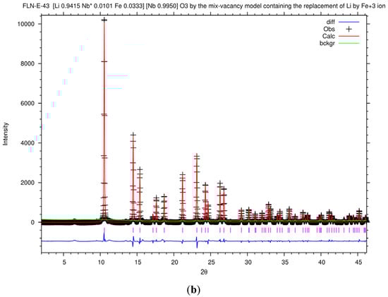 The powder diffraction patterns of congruent LiNbO3 and Fe-doped LiNbO3 collected by synchrotron radiation were shown in Figure 6, which is demonstrated with the wavelength of Cu Kα. The powder diffraction data were analyzed to refine the defect structure of our samples via the Rietveld refinement program GSAS. As mentioned above, the Li vacancy model, the Nb vacancy model, and the mixed-vacancy model proposed by Li et al. would be adopted into the structure refinement in our work. Based on the data of DSC, shown in Table 1 and Figure 1, the peak intensity at the higher Tc is stronger than at the lower Tc and the phase of the lower Tc disappears in high Fe-doped samples. This means that the phase of the higher Tc is more stable than that of the lower Tc. Thus, the Xc calculated from the higher Tc peak was adopted to refine the structure of LN43.