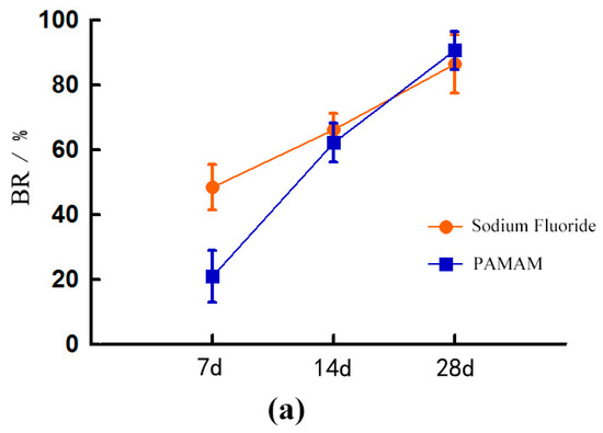 Over time, the blocking rate (BR) of the dentine tubules in the NaF group and the PAMAM group increased significantly. By contrast, the BR of the NaF group was significantly higher than that of the PAMAM group at the seventh day (p < 0.05). BR of the NaF group was slightly higher than that in the PAMAM group, but the difference was not statistically significant between the two groups at day 14 and day 28 (p > 0.1) (Figure 2).