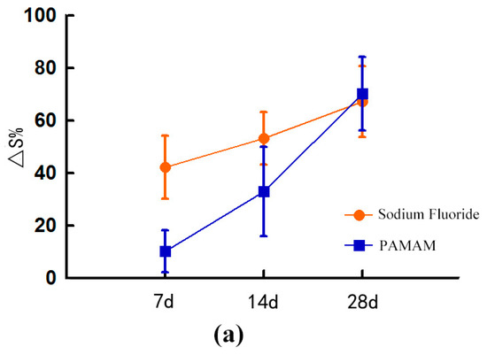 The Area change rate (∆S%) of the dentinal tubule of the NaF group and the PAMAM group increased. On day 7, ∆S% of the NaF group was significantly higher than that of the PAMAM group (p < 0.05). On day 14, ∆S% of the NaF group was still significantly higher than that of the PAMAM group (p < 0.05). On day 28, ∆S% of the PAMAM group was slightly higher than that of the SF group, although the difference was no longer significant (p > 0.1) (Figure 3).