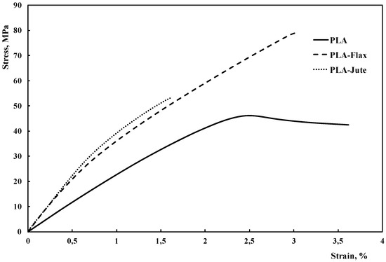 As concerns composite structures, the results clearly show that the presence of the fabrics leads to a significant increase of the modulus (almost twofold) in comparison to the neat PLA. This can be easily explained considering the stiffening effect due to the fabrics. However, only a marginal variation of the ductility occurs (except, although only partially, for the jute-containing composite). This suggests a good fiber-matrix adhesion. Furthermore, the presence of the flax fabric also leads to a significant increase of the tensile strength (up to 53%), while the jute fabric fails in imparting noteworthy improvements. This result is rather unexpected, and may be explained considering the reduction of the elongation at break [38], as further observable on the basis of the representative stress-strain curves shown in Figure 1. It can be also noticed that the presence of the fabrics modifies the fracture behavior, from a moderately ductile to a completely fragile one [15].