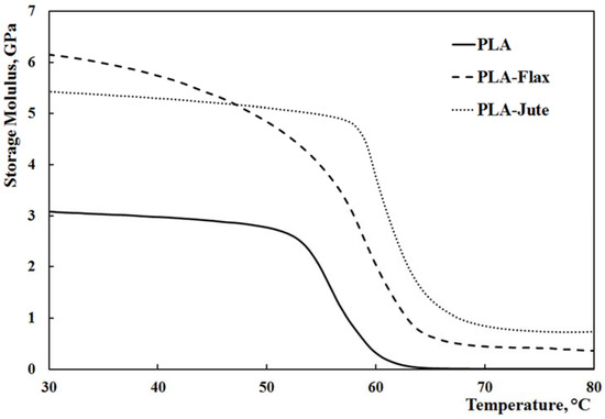Figure 2 reports the storage modulus, E’, as a function of the temperature, while Figure 3 shows the corresponding trend of the damping factor, Tanδ. The modulus of the composites is significantly higher than the PLA one, throughout the entire temperature range; furthermore, PLA-Jute composites show an enhanced thermomechanical stability, as clearly observable by considering the lower slope of the curve upon increasing the temperature. This can be further observed by taking into account the modulus at 30 °C (which is, basically, the room temperature) in relationship to the temperature at which the modulus is half of the initial value (T1/2, halving temperature), see Table 2. In addition to the composites showing higher halving temperatures than the neat PLA, the presence of jute fabrics as reinforcement leads to a slight increase of the halving temperature (approx. +6%), i.e., to an increase of the thermomechanical resistance of this composite. More considerations can also be drawn by considering the glass transition temperature, Tg, and the height of the damping (Tanδ) peak (Table 2). While the Tg values, calculated as the temperature at which the damping attains its maximum value [39,40], do not change much with the presence of the reinforcing fabrics, significant variations of the damping can be observed. Incorporation of fillers in a composite system typically affects the damping behavior, due to shear stress concentrations in the fibers along with viscoelastic energy dissipation in the matrix [39,41]. The filler–matrix adhesion directly affects Tanδ, i.e., a weak filler–matrix adhesion leads to higher Tanδ values, while a good filler–matrix adhesion hinders the mobility of the polymer chains, thus reducing the damping [41,42,43]. Furthermore, a low damping typically means that the composite has a good load bearing capability. The experimental results shown in Table 2 and Figure 3 clearly point out that the damping undergoes a dramatic decrease upon combining PLA with the fabrics, in comparison to the neat PLA. In addition, the jute-containing composite has an approx. 20% lower damping, in comparison to the flax-containing one. This suggests that the jute fabric leads to a composite with a higher load-bearing capability and a likewise stronger adhesion with the PLA matrix. This result is in agreement with the results from tensile tests reported above: In fact, the better adhesion between jute and PLA leads to a lower difference (i.e., about 50%) in terms of tensile strengths of the two composites, in comparison with the one shown by the two fabrics (about 140%).