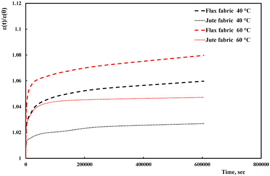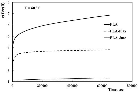 Figure 5 reports the normalized creep curves at 60 °C. The temperature increment of 20 °C leads to a dramatic increase of the creep deformations. More in details, the PLA normalized deformation increases from values below 2, to values near to 7, and this can be explained by considering that the test temperature is very close to the glass transition temperature (i.e., about 64 °C, see Table 2). The presence of the flax fabric leads to a drastic reduction of the creep deformation (see Table 3). After 65,000 s, the creep deformation of the flax composites is the 66% of that of the neat PLA (56% at the end of the creep test). However, the most relevant result is obtained by the jute-containing composites. As a matter of fact, the presence of jute fabric leads to a creep curve with a nearly-constant trend, very close to 1: This indicates that creep (viscous) deformations are practically neutralized by the jute fabric, leading to an almost completely elastic behavior. It is worth noting from Table 3 that the creep deformation showed by the jute composite remains about 80% lower than that of the neat PLA, during the entire creep test. This means that a remarkable result is obtained: at relatively higher temperatures, the creep deformations of PLA are almost neutralized by the presence of the jute fabrics.