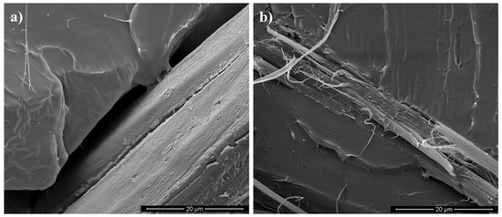 However, since the fabric has not only longitudinal fibers (i.e., perpendicular to the fracture surface) but also transverse fibers (parallel to the fracture surface), the comparison between the two composites is also reported in Figure 8a,d, which better show the interface between the polymer matrix and the transverse fibers.