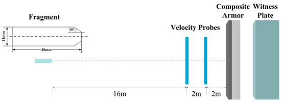 Fragment simulating projectiles are the reference penetrators which are used to simulate artillery shell fragments [19,20]. The shape is non-axisymmetric, and the dimensions and material properties fulfill the requirements of Military Specification MIL-P-46593A [21]. In this work, a Φ11 mm × 40 mm 1045-steel fragment with a wedge-shaped nose, is used in the experiments. With an area of 300 × 300 mm2, the composite-structure armor consists of an 8 mm-thick 30CrMnMo plate and a 21 mm-thick UHMWPE laminate. A 60 mm-thick aluminum alloy plate, placed 42-mm behind the laminate, serves as a witness plate. Boundaries of the composite armor are fully-constrained, and the velocity of normal impact is 1798 m/s. A schematic of the experimental setup is shown in Figure 1.