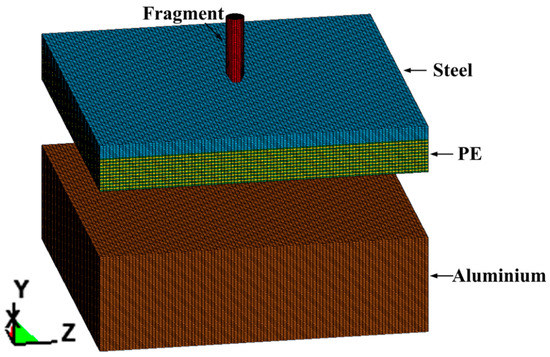 The progress of projectile-target interaction is simulated using the non-linear dynamics finite element software LS-Dyna. The three-dimensional (3D) model is composed of three parts, namely the: fragment, steel-PE composite armor, and witness plate; the initial state of the model is shown in Figure 2.