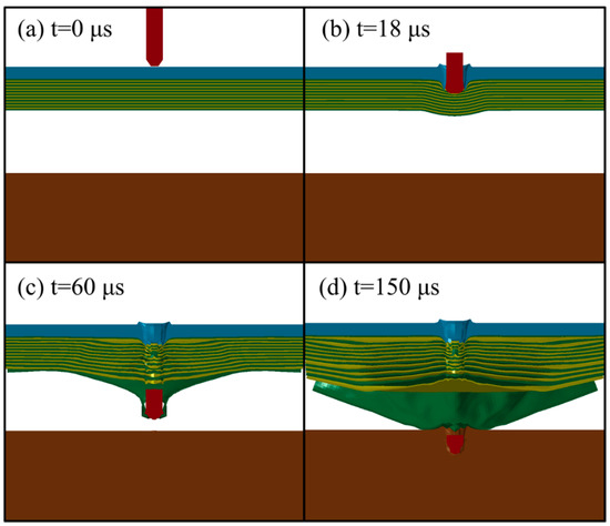 Figure 3 shows the finite element simulation results of the fragment penetrating the composite armor at various times. The initial state at 0 μs, and the steel and PE laminates penetrated at 18 μs and 60 μs are shown in Figure 3a–c, respectively. At 150 μs, the fragment becomes stuck in the witness plate (see Figure 3d).