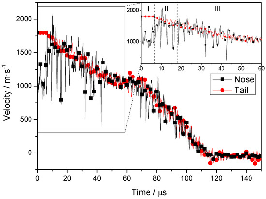In stage I, the stress generated when the nose reaches the target is far greater than the yield stress of the projectile material and, hence, plastic deformation and element failure occurs in the nose. Simultaneously, the velocity of the nose decreases from an initial value of 1798 m/s to ~1000 m/s. The velocity increases to 1700 m/s as the high-speed tail moves forward, and the velocities of the nose and tail become basically the same. An elastic wave speed () of 5075 m/s is obtained for the projectile. Considering that the initial length of the projectile is 40 mm, a maximum time of 7.8 μs is required for transmission of the wave from the nose to the tail. The simulation results (see Figure 5) show that the velocity of the tail remains constant at first, and then decreases after 6.5 μs. This indicates that a time of 6.5 μs is required for transmission of the stress wave. The slight differences between the simulation results and the theoretical predictions may have resulted from the wedge structure in the nose and erosion-induced shortening of the projectile [33].