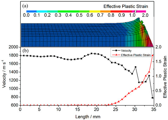 The velocities of the nose and tail are similar and decrease simultaneously during stage II. However, the velocity of the nose fluctuates more than that of the tail, owing to the high-frequency interaction between the projectile and the target [34]; this interaction persists until the nose penetrates the steel plate at 18 μs. The result obtained at a typical time of t = 12 μs is further analyzed, as shown in Figure 7. At t = 12 μs, the length of the eroded projectile is 30 mm and the velocity of the nodes on the medial axis is ~1667 m/s. The first third of the projectile undergoes plastic deformation owing to the non-zero plastic strain in this region, which includes the nose element, where the maximum plastic strain is 0.71. The remaining two-thirds of the projectile undergo only elastic deformation. Interestingly, the node velocities of these two regions are basically the same, indicating that the node velocity is independent of the plastic deformation of the projectile. In contrast to the previous stage, the projectile reaches steady state in stage II.