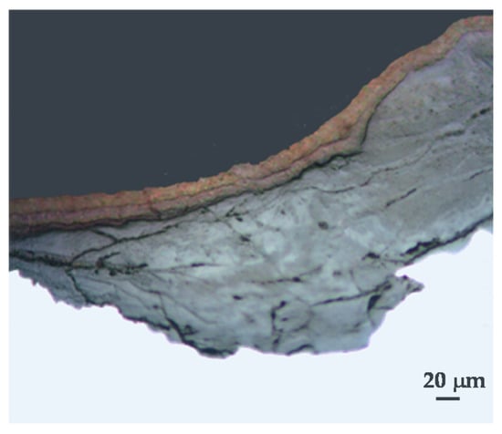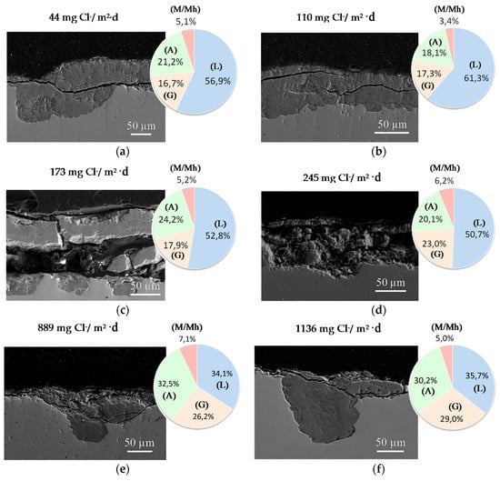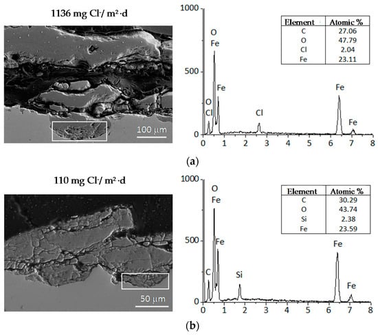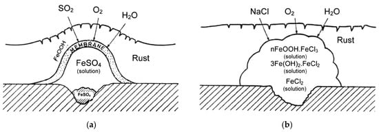 Unlike SO2 pollution, Cl− pollution does not cause the formation of nests but Cl− agglomerates. The literature also sometimes mentions the formation of “chloride nests” [24], but the osmotic pressure of FeCl2 or NaCl does not influence corrosive activity, which instead is determined by other causes such as the ability of ferrous and ferric chlorides to form complexes (nFeOOH·FeCl3) or a solution of FeCl3 in FeOOH in the form of a gel. No amorphous oxide/hydroxide membrane is originated (Figure 1b) [22].