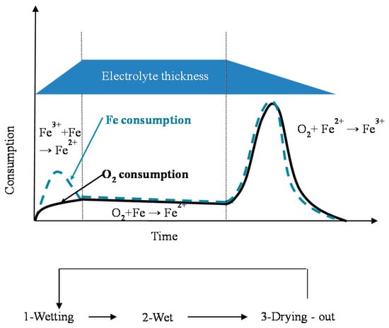 In particular, attention is drawn to the important atmospheric rusting cycle mechanism proposed by Stratmann [38]. In an electrochemical study of phase transitions in rust layers, Stratmann showed that when a pre-rusted iron sample was wetted, iron dissolution was not immediately balanced by a reaction with oxygen, but rather by the reduction of the preexisting rust (lepidocrocite) with later reoxidation of the reduced species. Thus, Stratmann [38] proposed dividing the AC mechanism of pure iron into the following three stages (Figure 2): (a) wetting of the dry surface; (b) wet surface; and (c) drying-out of the surface.