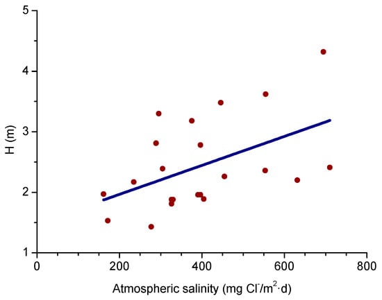 A relationship has been seen between salinity and wave height [64]. The graph in Figure 3 shows the variation of atmospheric salinity with the average spectral wave height. As can be seen in the figure, monthly average spectral wave height values of 1.5–2.0 m are sufficient to produce high monthly average salinity values of 100–200 mg Cl−/m2·d.