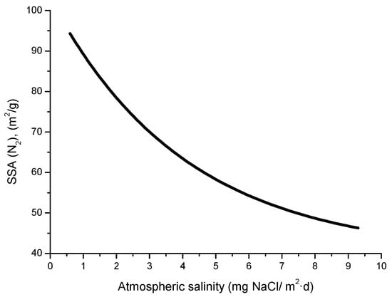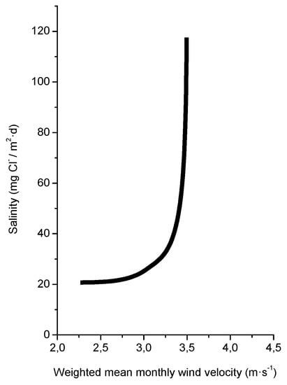 Nevertheless, the topography of the land and the general wind regime of the zone can also lead continental winds to influence salinity values. This has been shown in a study by the Academy of Sciences in Russia [65,68] involving long-term studies at Murmansk and Vladivostok, which concluded that chloride entrainment in both areas was dependent on both the average speed of total winds (marine + continental) and the product of the wind speed by its duration (wind power).