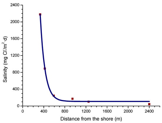 In a recent study by Alcántara et al. [64], it was seen that the variation in salinity with the distance from the shoreline (Figure 5) clearly showed an exponential relationship.