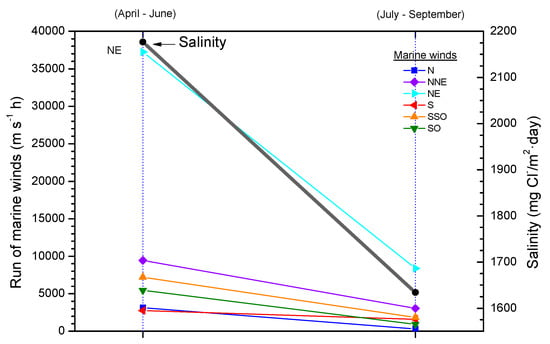 Comparison of the atmospheric salinity at an exposure site and the average wind speed often fails to yield a clear relationship between both parameters. Calculation of the average wind speed takes into account the speeds recorded in all wind directions, and not only marine winds, which it would be reasonable to suppose are those that govern the presence of marine aerosol masses in coastal regions. In this sense it would be interesting to know whether the atmospheric salinity at the site is related with the run of marine winds, which is the sum of adding together the marine wind speed in each direction multiplied by the time it has been blowing [64]. Figure 6 has been prepared accordingly and clearly explains the decrease in the salinity value obtained in the second three-month period by a decline in the run of all marine winds, especially the most frequent (north-easterly, NE). Therefore, more than the average wind speed in the study area, the total run of marine winds is the parameter that has the greatest influence on the atmospheric salinity of the test site.