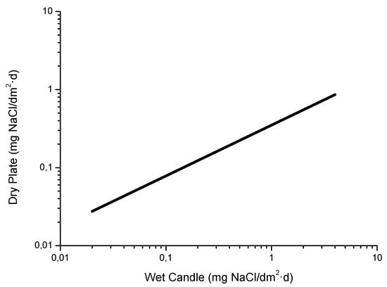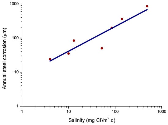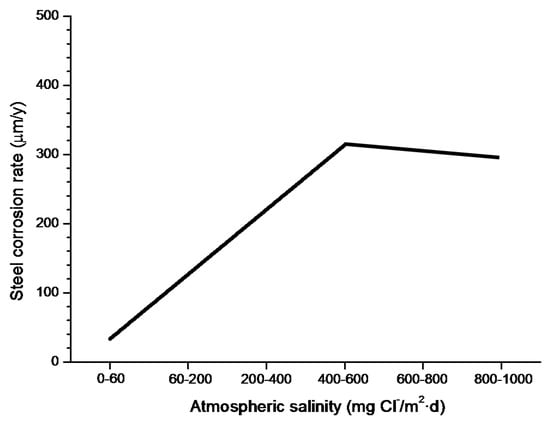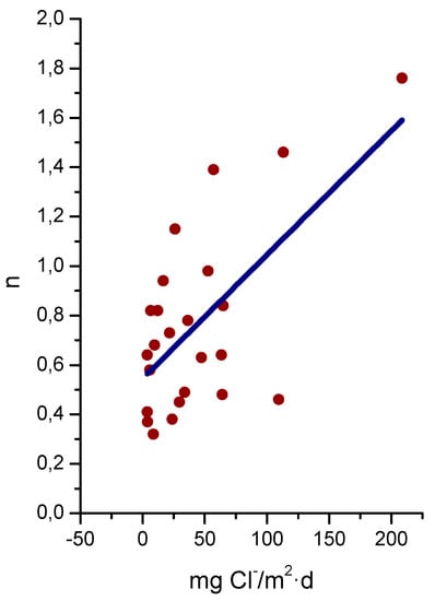 Salinity in marine atmospheres varies within very broad limits (<5 to >300 mg Cl−/m2·d) [50]. While extremely high values have been recorded close to surf, salinity at other points on the shoreline near calmer waters is no more than moderate. The concentration of marine aerosol decreases with altitude [51,52]. Meira et al. find that this relationship can be represented by an exponential decrease function which is influenced by the wind regime [52].