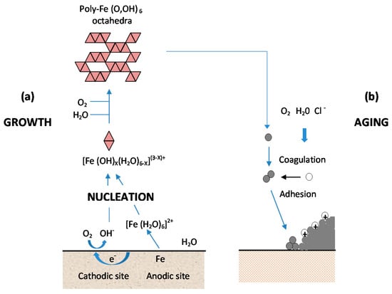 - Worch, H.; Forker, W.; Rahner, D. Rust formation on iron. A model. Werkst. Korros. 1983, 34, 402–410. [Google Scholar] [CrossRef]