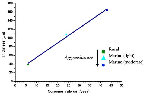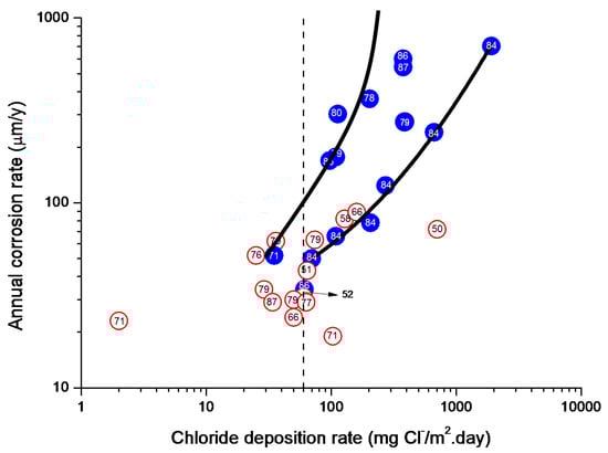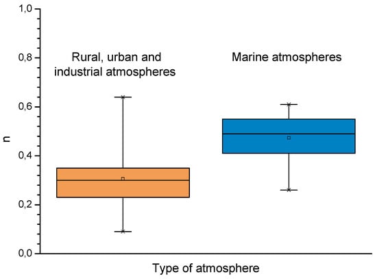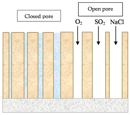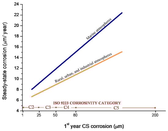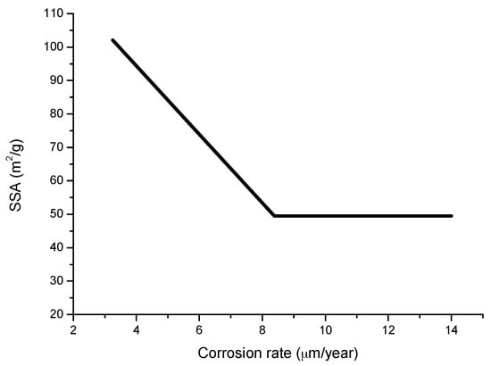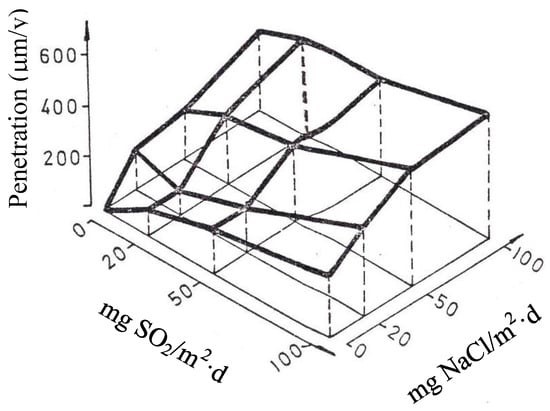 The effect of SO2 on AC has been studied by many authors [7]. SO2 is often found in the atmosphere in concentrations that vary considerably depending on the type of industries in the region, the presence of power plants, time of year, etc. SO2 is much more aggressive to steel when its concentration exceeds 0.1 mg·m−3, a level that is easily reached in many towns, especially in winter. Fortunately, the SO2 concentration in urban air has decreased greatly in recent years due to efforts to reduce pollution [19].