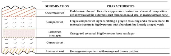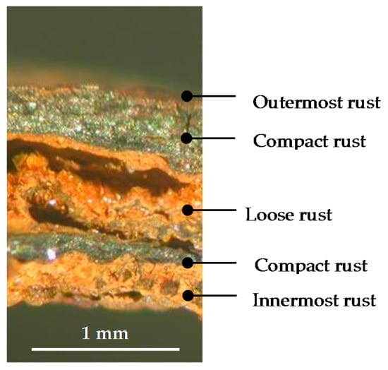 Knowledge of the rust layer structure is another aspect widely studied by researchers. The techniques traditionally used are optical microscopy (OM), polarised light microscopy, scanning electron microscopy (SEM) and transmission electron microscopy (TEM)/electron diffraction (ED). In order to characterise corrosion product structures in various scales, Kimura et al. [45] use several analytical approaches that are sensitive to three structural-correlation lengths: long-range order (LRO) (>50 nm), middle-range order (MRO) (~1–50 nm), and short-range order (SRO) (<1 nm) and Konishi et al. employ X-ray absorption fine structure analysis (XAFS) methods, including extended XAFS and X-ray absorption near-edge structure (XANES), for characterisation of rust layers formed on Fe, Fe-Ni and Fe-Cr alloys exposed to Cl−-rich environments [46].