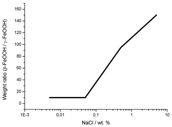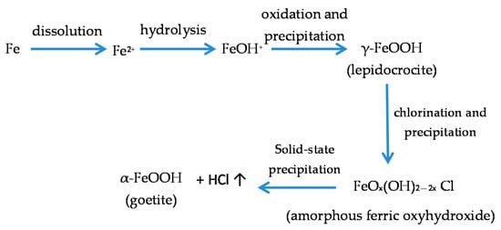 - Ishikawa, T.; Isa, R.; Kandori, K.; Nakayama, T.; Tsubota, T. Influences of metal chlorides and sulfates on the formation of β-FeOOH particles by aerial oxidation. J. Electrochem. Soc 2004, 151, B586–B594. [Google Scholar] [CrossRef]