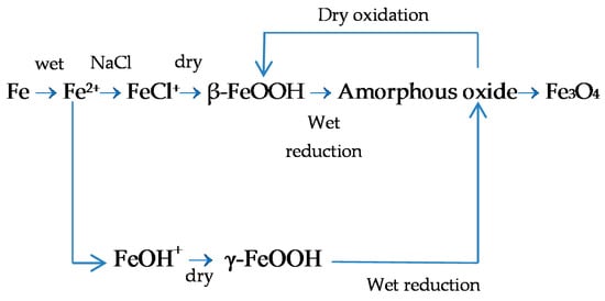 Schematic representation according to Stratmann [38] of atmospheric rusting cyclic mechanism.