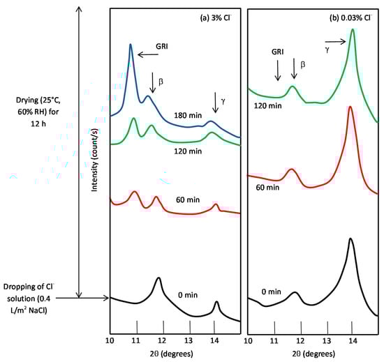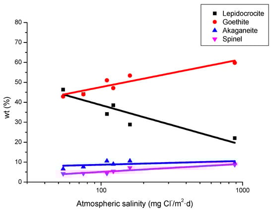 Nishimura et al. [10,39] carried out a laboratory study of the electrochemical behaviour of rust formed on CS in wet/dry cycles in solutions containing Cl− ions, simulating exposure in marine atmospheres. They observed that akaganeite formation was the cause which enormously accelerated the AC process in this type of atmosphere, being electrochemically reduced and consumed during the wetting of the metallic surface, in contrast to the important role played by lepidocrocite in steel corrosion in Cl−-free atmospheres [38].