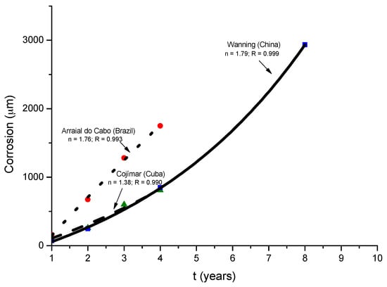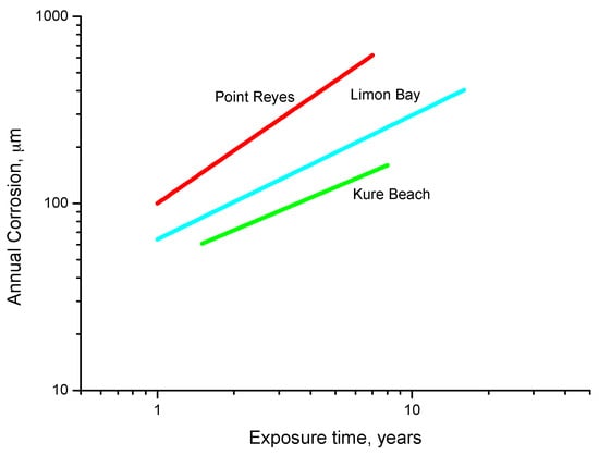 - Panchenko, Y.M.; Marshakov, A.I. Long-term prediction of metal corrosion losses in atmosphere using a power-linear function. Corros. Sci. 2016, 109, 217–229. [Google Scholar] [CrossRef]