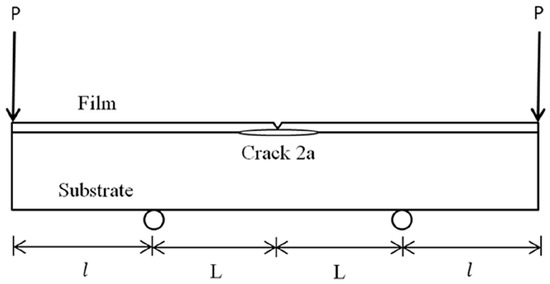 The fracture toughness of the nanocomposite film deposited on the substrate with an interfacial crack was determined by a four-point bending test. A central notch is cut through the thickness of the nanocomposite film and a symmetrical crack is placed along the interface with a crack length of 2a as shown in Figure 4. The Young’s modulus and thickness of the nanocomposite film are and , respectively, and are associated with the substrate. The specimen is subjected to the four-point bending test. The interfacial crack located between the two inner loading points is under a constant moment condition. The strain energy release rate exhibits steady-state characteristics when the crack length is significantly exceeded to the thickness of the nanocomposite film. The specimen in the steady-state region is subjected to a pure bending moment as shown in Figure 5. As the length of the crack extends from 2a to , the difference of the strain energy in the specimen before and after the crack propagation is simply the difference of the strain energy stored in the center and at the free end.