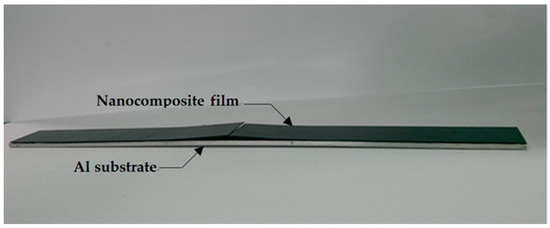 The Young’s modulus of nanocomposite film deposited on a substrate was determined by a three-point bending test. In a bending test, the deflection of the film/substrate composite beam is dependent on the bending stiffness of the composite beam, which is related to the elastic moduli of both the film and substrate. Thus, the Young’s modulus of the film can be deduced by comparing the deflections between the substrate and film/substrate specimens. In this work, a simple relation derived by Bao et al. [27] was adopted to determine the elastic modulus of the film from the three-point bending test. Based on beam theory, the deflection of a beam subjected to a three-point bending test can be written as: