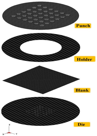 Four-node quadrilateral degenerated shell elements are utilized in this work for deriving the stiffness matrix, and Finite Element Analysis (FEA) [] is employed for the pre-processing and post-processing. Since the die and stainless steel plates are supposed to be symmetric, the simulation is performed against a 1/4 figure to effectively reduce the analysis time for arithmetic processing. The die and the metallic plate are then meshed with quadrilateral elements. These meshed data are transformed to the 3D elastic-plastic FEA program for the following simulation analysis.