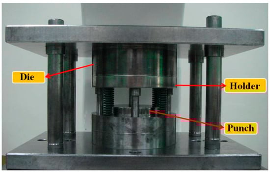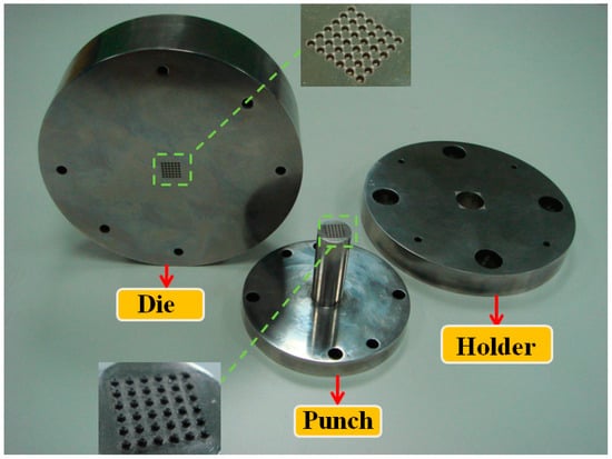 The micro-channel array deep drawing process for stainless steel plate is shown in Figure 5. In total, there are five steps in this geometric deformation process. The plate is gradually deformed during micro-channel forming until the unloading state. Throughout the entire micro-channel forming process, the contact, separation, and friction conditions can be accurately estimated by the r-minimum (rmin) rule. The rmin rule is mainly for the definition of boundary conditions for degenerated four-node shell elements during deformation analyses. Figure 6 is the prototype of tools employed in the micro-channel array drawing experiment, including punch, die bottom, and blank holder. The test rig and the electro press (JANOME JP-5004, JANOME Sewing Machines Co., Ltd., Tokyo, Japan) for micro-channel array forming process are shown in Figure 7 and Figure 8 respectively.