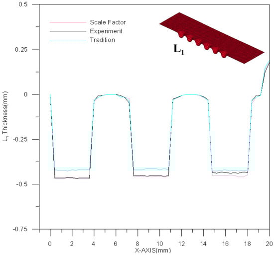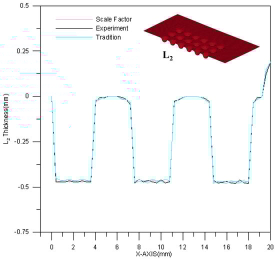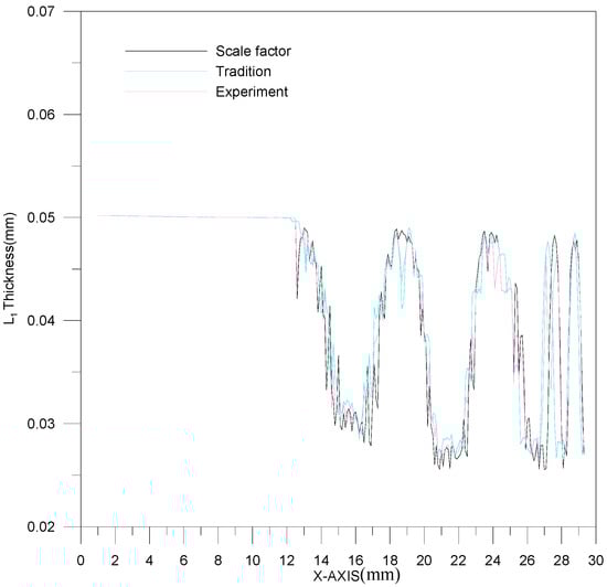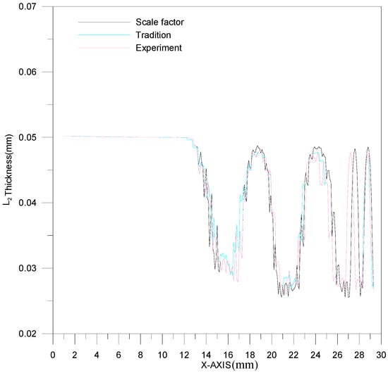 The thickness of the L1 section is shown in Figure 13. The range of thickness variation is 0.0264~0.033 mm. Based on Figure 13, the experimental result is between the results of the two theoretical models. In addition, among all the processed channels in one plate, the first channel is the thinnest. The thickness variations for these three results (experimental results, traditional material models and modified scale-factor material model) are similar, and no significant error is observed. The thickness of the L2 section is shown in Figure 14. The L2 section is thicker than the L1 section. The thickness difference is about 0.003 mm.