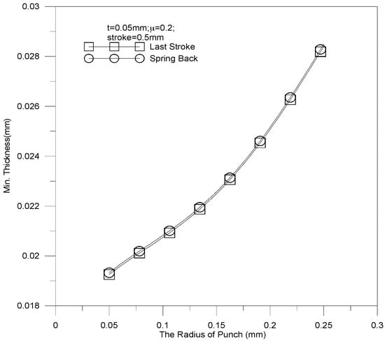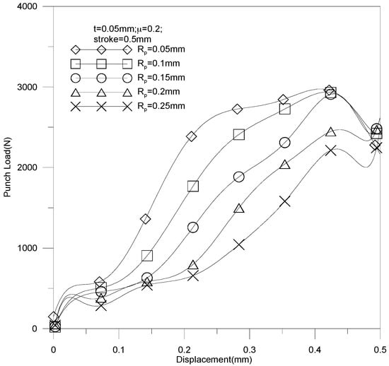 The thickness increases linearly when the fillet radius is increased. The minimal thickness is 0.0201 mm against a punch fillet radius of 0.05 mm. The thickest sheet thickness is 0.0278 mm against a punch fillet radius of 0.25 mm. Apparently, an acute angle of channel would be formed more easily by a small punch fillet radius than by a large one, and may lead to material fracture. The punch load against stroke under various punch fillet radiuses is reported in Figure 17. It should be noticed that a small punch fillet radius leads to a large punch load; e.g., the maximal load (about 5000 N) is induced by a tool radius of 0.05 mm. As a result, the punch load can be reduced by increasing the punch fillet radius.
