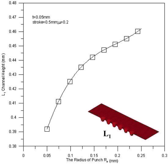 The dimensional effect of punch fillet radius on the thickness of stainless steel plate is demonstrated in Figure 16. The parameters of the micro-channel array forming process are as follows: