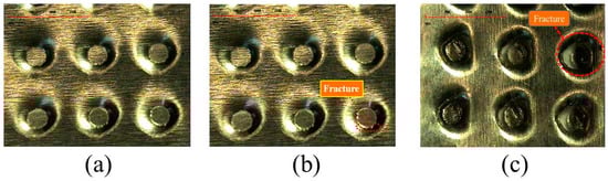 Processed stainless steel plate (a) stroke of 0.5 mm; (b) stroke of 0.55 mm; (c) stroke of 0.6 mm.