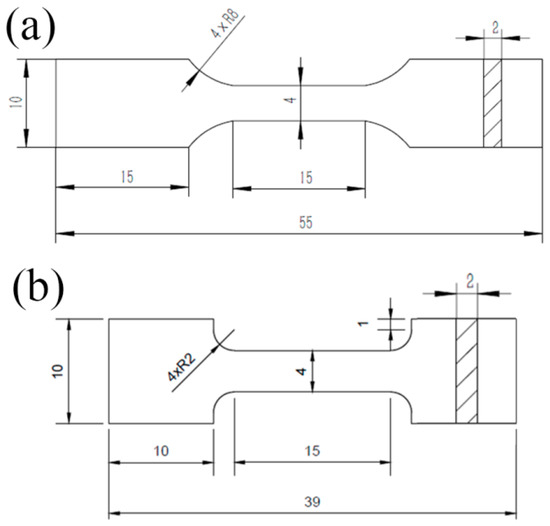 Dimensioned schematic of the room-temperature (a) and high-temperature (b) tensile specimens (unit: mm).
