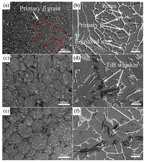 SEM micrographs of 0 vol % (a,b); 2.5 vol % (c,d); and 5 vol % TiBw/TA15 (e,f) with low magnification (a,c,e) and high magnification (b,d,f).
