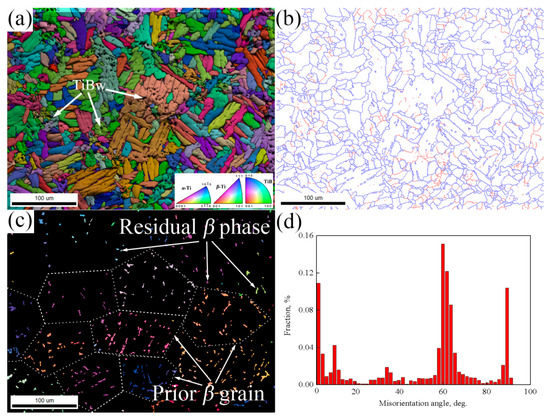 EBSD results of 2.5 vol % TiBw/TA15: (a) IPF + IQ + GB; (b) EBSD results showing the LAGBs (red lines, 2°–15°) and HAGBs (blue lines, 15°–180°); (c) residual β phase; (d) misorientation angle of α-Ti.