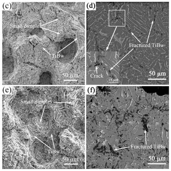 As the volume fraction of the reinforcement increases (Figure 7e,f), the basic features are the same as the 2.5 vol % TiBw/TA15 (Figure 7c,d). It is noteworthy that the content of whiskers distributed at the interface increases, and the dimples are the smallest and shallowest, indicating that there is only a small plastic deformation before fracture. Moreover, the whisker content increases at the interface, resulting in the increase of whiskers parallel to the tensile load direction and perpendicular to the tensile load direction. That is to say, the connectivity of the matrix becomes worse and the number of TiBw which are beneficial for improving strength also increases. Therefore, the plastic reduction is more obvious, and the strength and hardness increase.