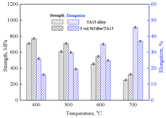 Figure 8 shows the high-temperature tensile properties of the as-sintered monolithic TA15 alloy and 5 vol % TiBw/TA15 composites at 400 °C, 500 °C, 600 °C, and 700 °C. Due to the limited conditions, the extensometer is not used during the high-temperature tensile process, so there are no yield strengths in the results. Compared to the monolithic TA15 alloy, the tensile strength of 5 vol % TiBw/TA15 composites are increased to 773 MPa, 711 MPa, 549 MPa, and 324 MPa from 710 MPa, 609 MPa, 456 MPa, and 254 MPa at 400 °C, 500 °C, 600 °C, and 700 °C, respectively. That is to say, the tensile strength of 5 vol % TiBw/TA15 can be increased by 10.4%, 16.7%, 20.4%, and 27.5% compared with that of monolithic as-sintered TA15 alloy at 400 °C, 500 °C, 600 °C and 700 °C, respectively. In addition, the tensile elongation of the composites decreases compared to that of the as-sintered monolithic TA15 alloy, and both increase with the increasing drawing temperature. In detail, the tensile elongation of the 5 vol % TiBw/TA15 composites slightly decreases to 16%, 19.5%, 24.9%, and 37% from 26%, 30%, 35.1%, and 45.6% at 400 °C, 500 °C, 600 °C, and 700 °C, respectively. Therefore, the high-temperature tensile properties of composites are enhanced by the addition of the TiBw. The reason for the improvement in the high-temperature tensile strength is that TiBw distributed at the grain boundaries effectively decreases the grain boundary weakening effect at high temperature, and similar results have been reported in TiBw/Ti60 composites [14], TiBw/TC4 composites [35], and TiC/TA15 composites [26]. With the addition of TiBw, the high-temperature tensile elongation of the composites decreases obviously. The reason is the same as for the room-temperature tensile elongation.