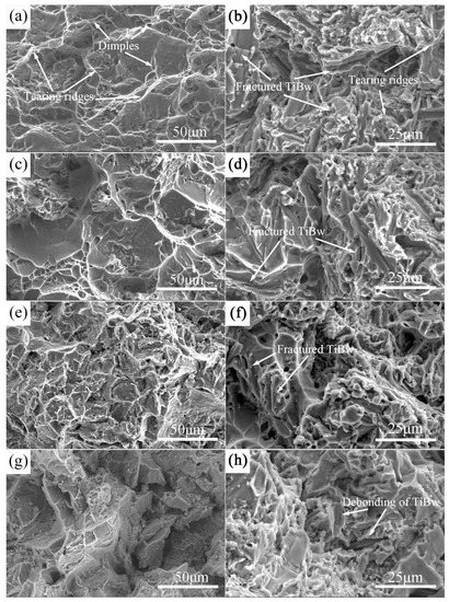 High-temperature SEM fracture of as-sintered monolithic TA15 alloy at 400 °C (a); 500 °C (c); 600 °C (e) and 700 °C (g); and of 5 vol % TiBw/TA15 composites at 400 °C (b); 500 °C (d); 600 °C (f); and 700 °C (h).