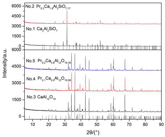 | 5 | Pr0.2Ca0.8Al12O19.16 | 88.59 | 4.92 | 0 | 6.49 | 0.33 |