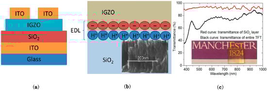 (a) Schematic diagram of transparent EDL transistors; (b) Schematic cross-sectional view of an EDL TFT when applying a positive gate voltage. Inset: cross-sectional scanning electron microscope view of the gate dielectric layer; (c) Optical transmission spectra of the thickest part in the TFT (black curve) and SiO2 layer (red curve). Inset: a photo of the transparent TFT on glass substrate.